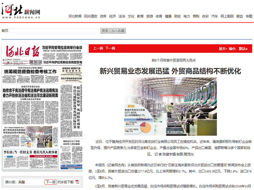 青龍劍釘業(yè)在2018年10月10日《河北日報》頭版被刊登,這是在《河北經(jīng)濟(jì)日報》被刊登后的又一次登上省日報。