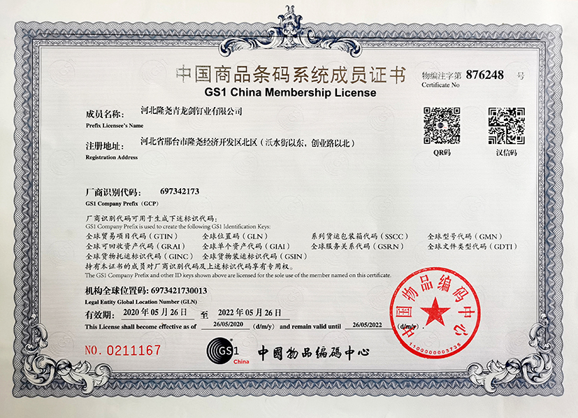 青龍劍釘業有限公司已成為中國商品條碼系統成員,從2021年起青龍劍全系產品編入中國物品條碼系統。自此青龍劍產品實現了進商超、建材自選賣場、智能分揀倉庫等標準化便捷掃碼進出庫功能。